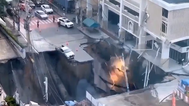 Terrifying footage showed the moment the ground dramatically gave way in front of Vajira Hospital in central Bangkok